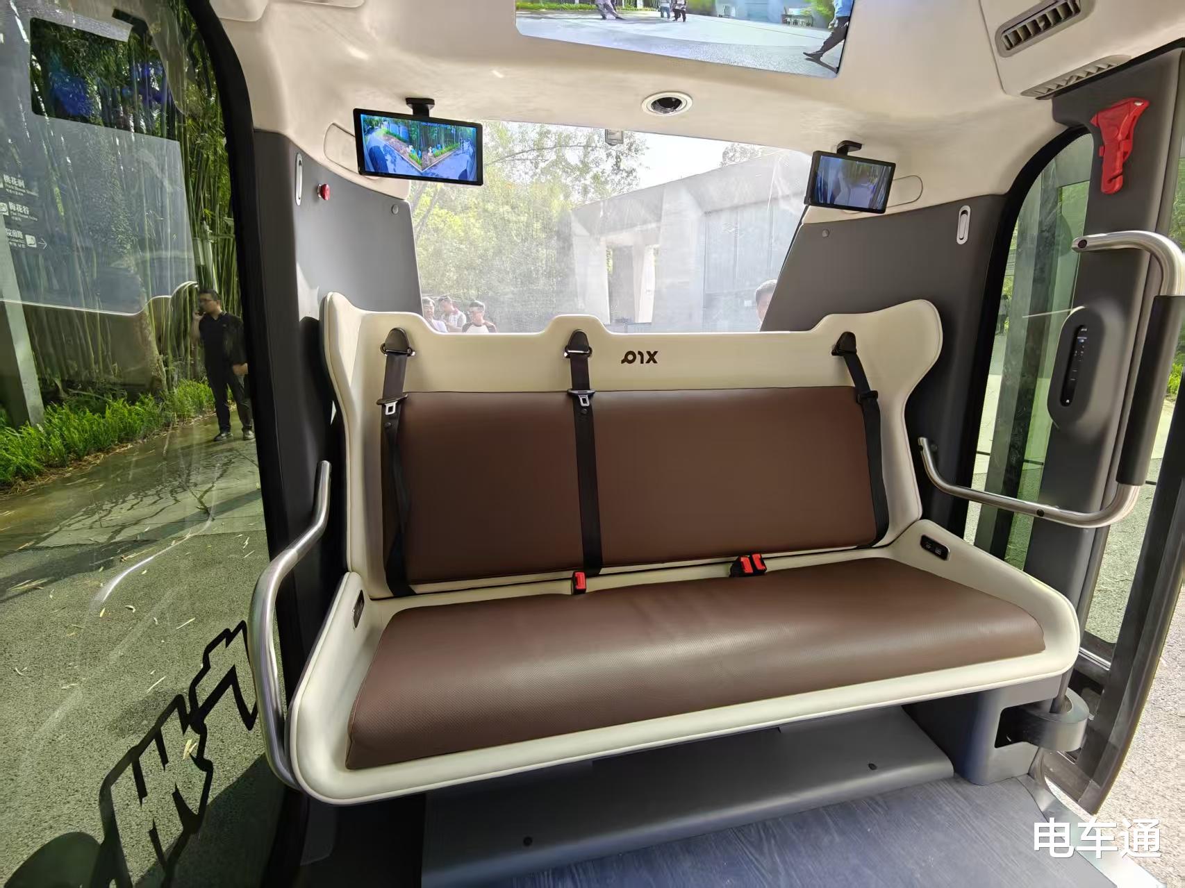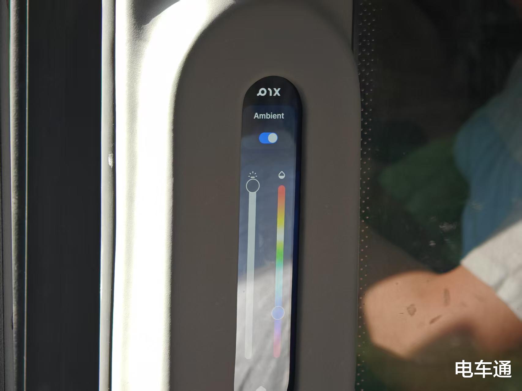 座椅两边各有一个USB充电接口。靠门一侧还有两块条状的触控屏,乘客可以自己调整空调温度/风速、氛围灯颜色等。车内的控制面板和状态信息显示的都是英文,显然这辆车的本地化适配工作还没完全做好。