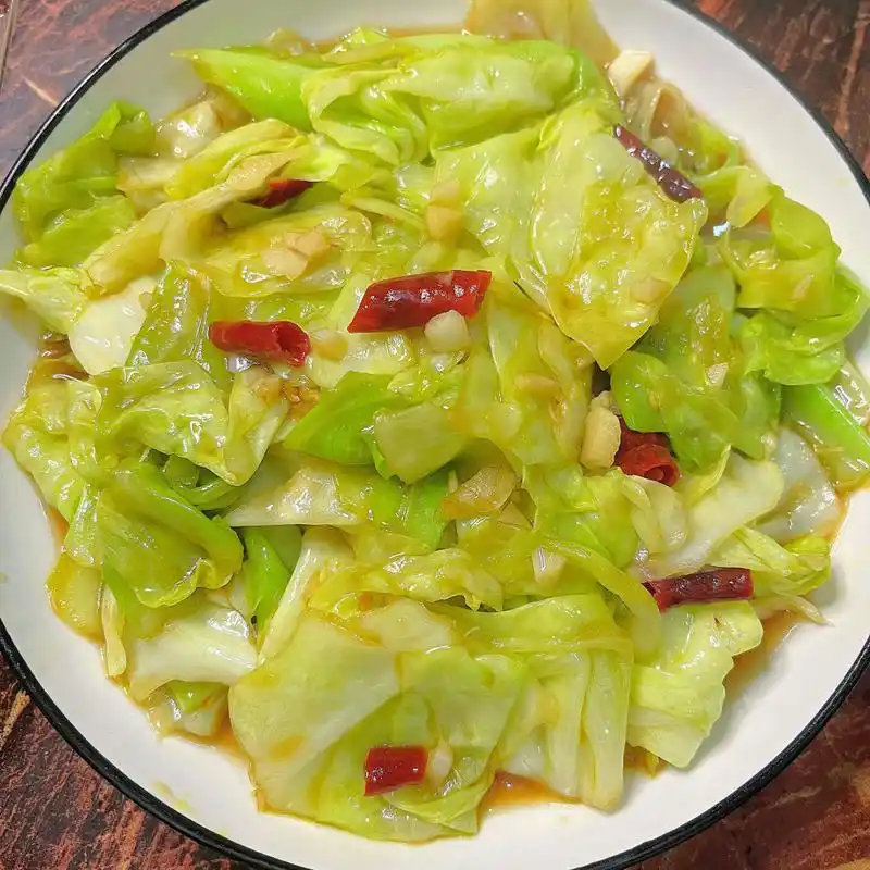 最后沿锅边淋入 2勺生抽(高温会让酱油的香气瞬间爆发),加半勺糖提鲜,再撒少许盐调味(生抽有咸味,盐要少放)。全程不盖锅盖,继续大火翻炒10秒,让调料均匀裹在包菜上,立马关火!