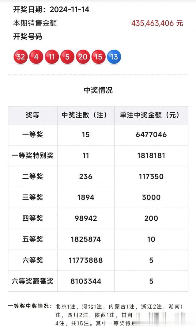 开奖号码为红球:04、05、11、15、20、32;蓝球:13。一等奖开出15注,符合派奖条件的有11注,深圳的彩民最为幸运,喜中四注,让我们一起期待是不是来自同一人吧!