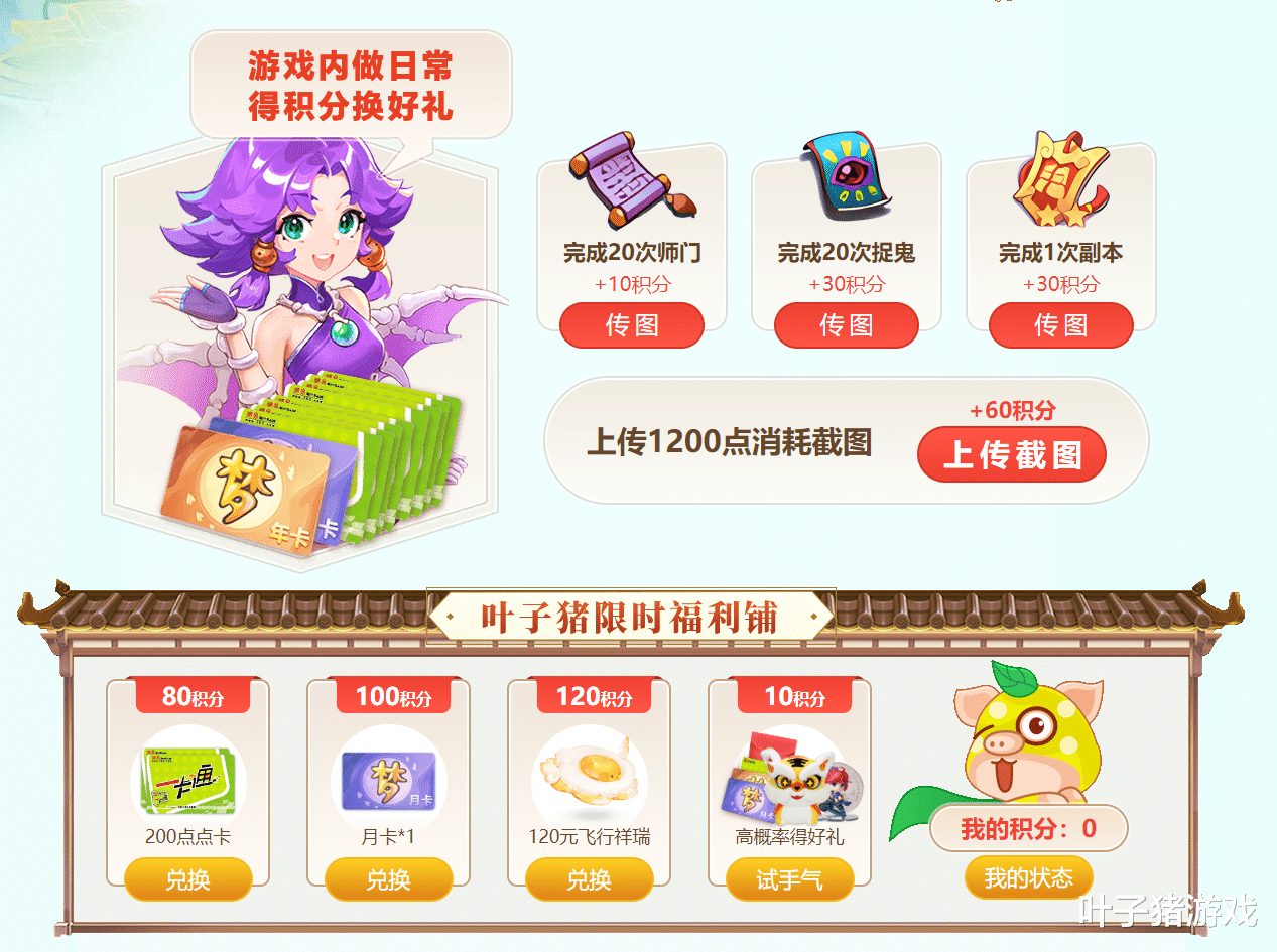 除此之外,大家还可以通过做日常任务的方式积累积分。比如,你一天之内充值了1200点,并完成了20次师门、20次抓鬼,就可以直接兑换一张月卡。福利有限,各位小伙伴先到先得哦!