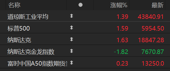 海外市场:周五晚上,美国道琼斯工业指数上涨1.39%,标普500上涨1.59%,纳斯达克指数上涨1.634%;纳斯达克金龙指数下跌1.82%,跌幅小于港股,富时中国A50指数期货上涨0.23%。