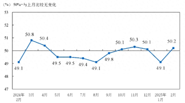 国家统计局:2月份,制造业采购经理指数(PMI)为50.2%,比上月上升1.1个百分点,制造业景气水平明显回升。从分类指数看,在构成制造业PMI的5个分类指数中,生产指数、新订单指数和供应商配送时间指数高于临界点,原材料库存指数和从业人员指数低于临界点。生产指数为52.5%,比上月上升2.7个百分点,表明制造业企业春节后生产活动较快恢复。新订单指数为51.1%,比上月上升1.9个百分点,表明制造业市场需求景气水平回升。原材料库存指数为47.0%,比上月下降0.7个百分点,表明制造业主要原材料库存量降幅有所扩大。从业人员指数为48.6%,比上月上升0.5个百分点,表明制造业企业用工景气度改善。供应商配送时间指数为51.0%,比上月上升0.7个百分点,表明制造业原材料供应商交货时间加快。