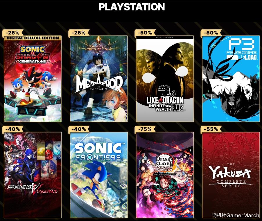 除了《暗喻幻想》之外,世嘉的经典高速动作游戏《索尼克×夏特世代重启》也首次加入促销行列。这款游戏让玩家有机会以更优惠的价格体验索尼克与夏特的冒险故事。同时,其他多款人气作品如《人中之龙8》豪华版套装、《人中之龙 维新!极》数字豪华版等也在促销行列中。