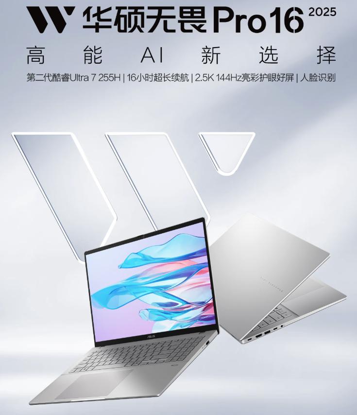 屏幕方面,配备2.5K亮彩护眼好屏,400尼特高亮度,100% sRGB色域覆盖,视觉观感细腻,16:10黄金比例,显示面积更大,有效提升内容生产力。还有高清+红外摄像头,暗光环境下也能疾速人脸解锁。更有丰富扩展接口、全尺寸静音背光键盘等高规配置,70Wh长寿大电池,至高支持16小时续航。这些配置加上4879的定价,可以说非常值得入手了。如果对于屏幕有更大需求的话,那华硕无畏 Pro16 酷睿版2025也值得考虑,2.5K高分辨率+144Hz高刷新率+100%sRGB高色域覆盖,利好创作者。同时可选性能更高的英特尔酷睿Ultra 7 255H AI处理器,16核心,3nm制程工艺,睿频高达5.1GHz,多应用/文档同时运行流畅不卡顿。