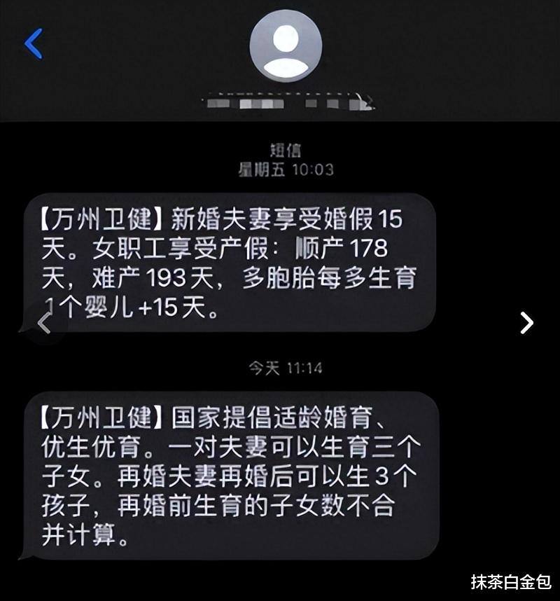 近日,有重庆万州区居民在社交平台表示,近期接连收到当地卫健委发送的群发短信,内容主要宣传生育政策。
