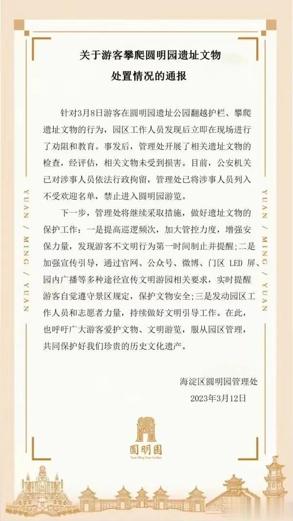 2023年3月12日在圆明园官方公众号发布事件处理通告,攀爬圆明园的游客已被警方和园区双双处理;
