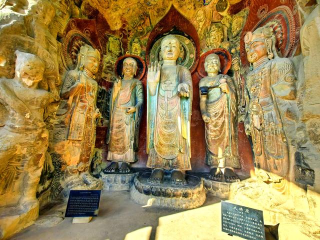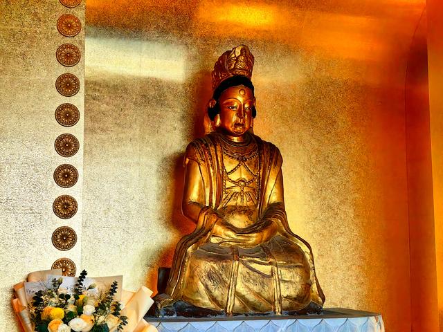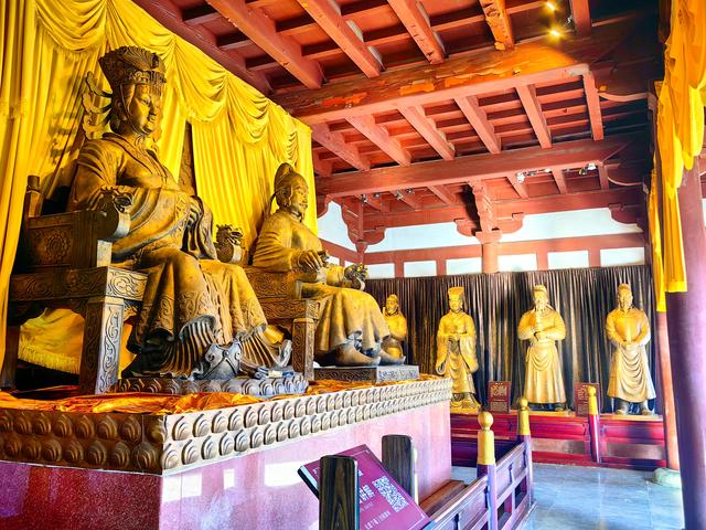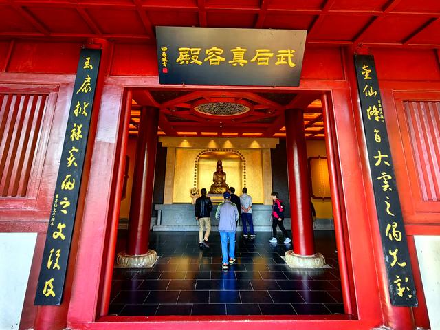 武后的真容殿里是按照武则天的真容雕刻的石像,1993年贴了金箔,显得金光灿灿。