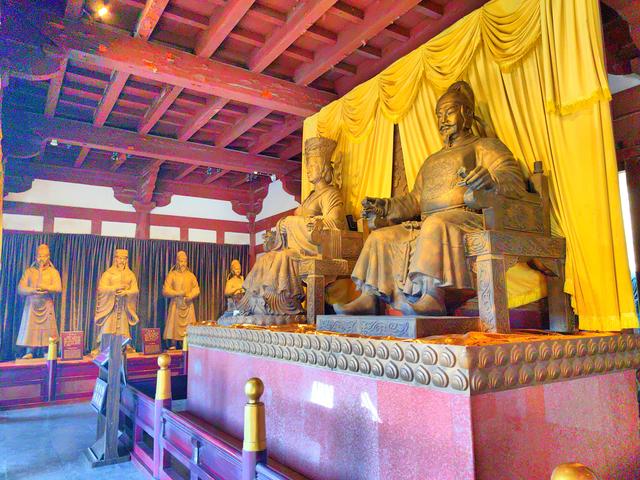 进入皇泽寺就是“二圣殿”,大殿正中,供奉着二圣:唐高宗和武则天。殿内左右两侧,塑有高宗、武周朝时期的九位著名大臣,分别是李勣、李义府、魏元忠、李昭德、狄仁杰、娄师德、张柬之、来俊臣、上官婉儿。