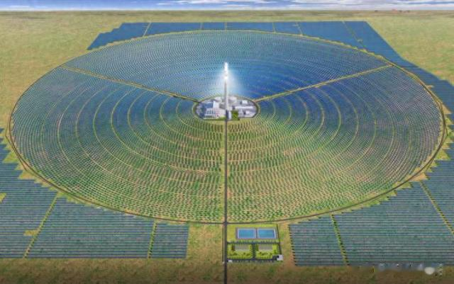 塔式太阳能发电主要组成:聚光集热系统、储换热系统和发电系统。聚光集热系统由定日镜、吸热塔(图中混凝土塔部分)、集热器等组成。定日镜实时跟踪太阳反射太阳光到集热器上(红色部分),集热器内的吸热工质吸收能量,用以后续发电。