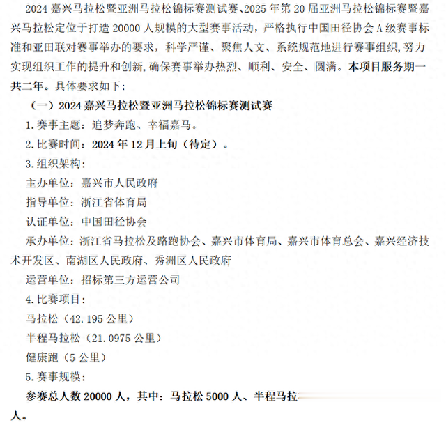 5月7日,2024浙江嘉兴马拉松发布二次招标公告,根据招标内容显示,2024嘉兴马拉松暨亚洲马拉松锦标赛测试赛拟于2024年12月上旬举办,赛事设马拉松、半程马拉松、5公里健康跑三个项目,总参赛规模为2万人。