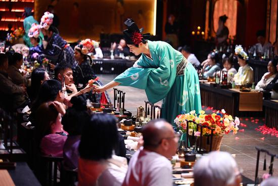 中国千年来的饮食传统形成了一套独有的、庄重的宴聚文化,“礼”始终贯穿其中。而如今的“礼”更像是一种仪式感。在兰齐宴赋,100分钟时间里,每一道菜品都有文化背景,伴随一段精妙的表演,有出处、有名头、有形式、有味道。通过齐、汉、唐、宋等四朝宴礼为历史背景,贯穿古典舞、茶艺、历史情景剧、实时互动等多种演艺形式,从宴、食、礼、乐等方面,运用中式美学,再现宫廷雅宴场景的食礼文化。