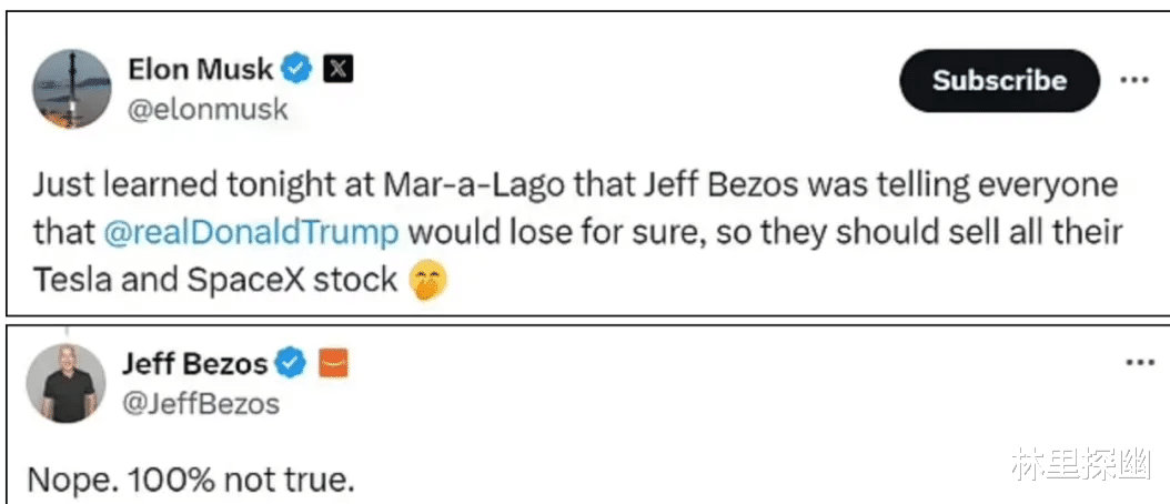 他说,他“刚刚从海湖庄园(特朗普的度假胜地)听说”:贝佐斯曾经到处和别人讲,赶紧抛售特斯拉和SpaceX的股票,因为特朗普11月5日绝对会输的!