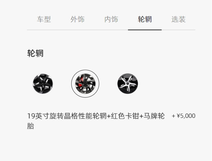 新车提供7种外观配色,其中夜影黑和晨曦白免费选择,另外还有溪石灰、幽兰紫、向阳金、云杉青(暂不支持选配)和溪石灰(哑光)5种颜色选配,前四种颜色选装费用2000元,最后一种哑光颜色选装费用5000元,标配18英寸轮毂,支持选装19英寸低风阻轮毂,其中旋转晶格版本选装费用3000元,旋转晶格性能轮毂+红色卡钳+马牌轮胎的选装费用是5000元(顶配车型标配),另外从620Pro版本开始支持选装电动剪刀门,选装费用22000元,不过剪刀门这个配置放在这样的车型上我总觉得有点“不伦不类”,没有强大的心理素质,我真不建议选择这个选装包