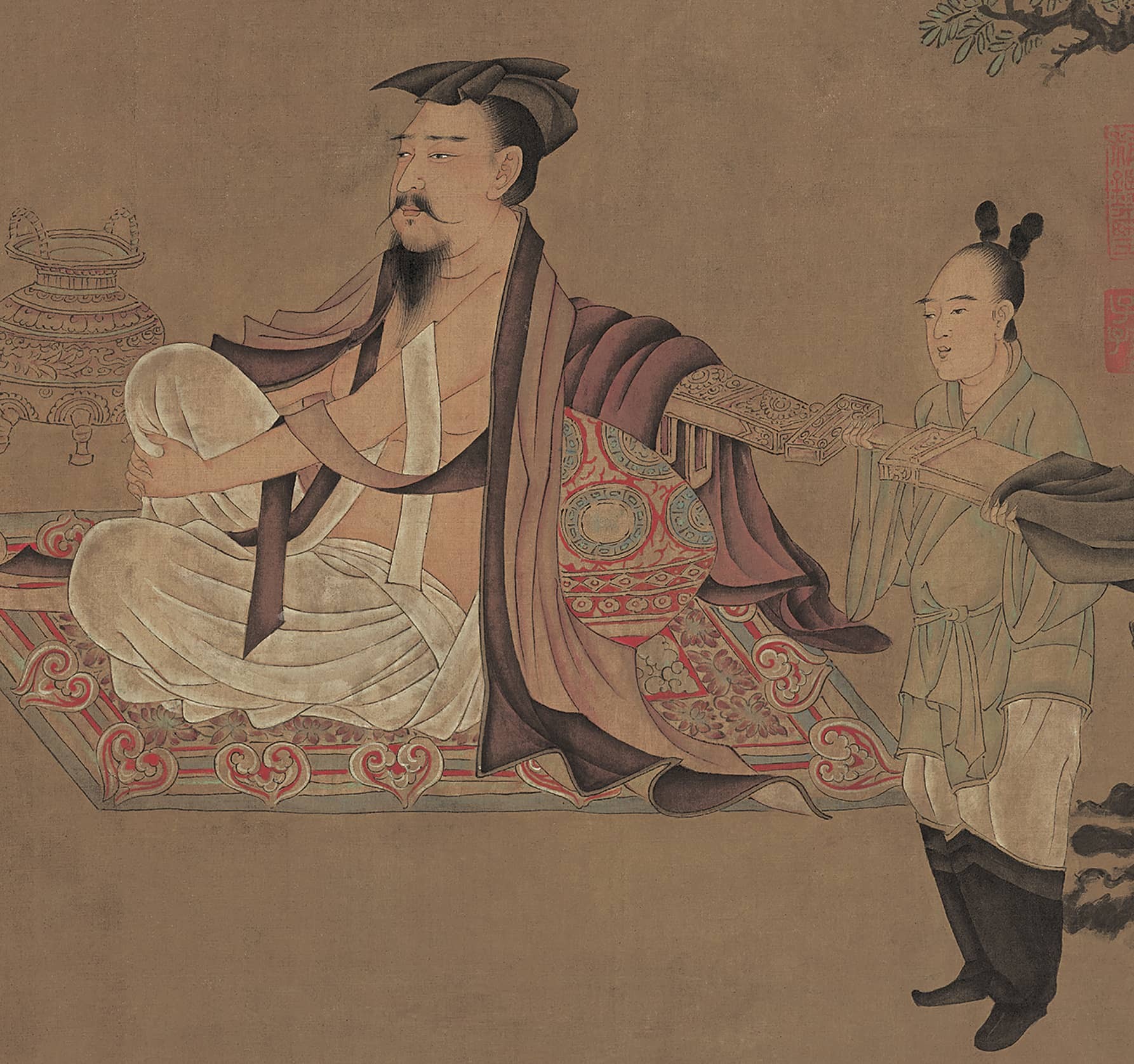 图中四个人物列坐,各有一侍者侍立于后。用树木、竹石和芭蕉相间隔,表现环境的冷僻静穆。用笔细劲凝练,是研究晚唐人物画的重要资料。据考证,此图为《竹林七贤图》残卷,四个人物为山涛、王戎、刘伶和阮籍。无款印。