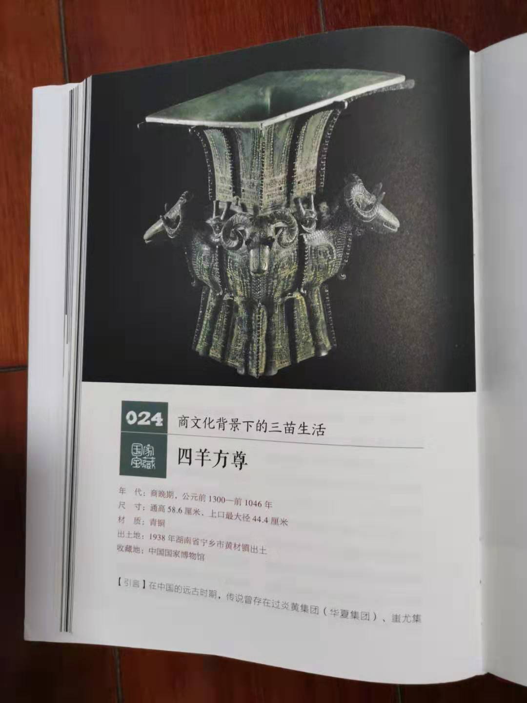 2016年春节,我在国家博物馆,有幸欣赏了四羊方尊。这件青铜器沉稳大方,造型别致,做工细腻,将创造性和艺术性完美结合,是商朝青铜器的杰出代表。最近我新购了《国家宝藏》,再次看到这件国宝,心中倍感亲切。用现代眼光审视四羊方尊,依然会被它质朴深厚的古典韵味折服。中华文明源远流长,博大精深,从未断绝。文物的存在,是民族传承的纽带。文物的积淀,是文明进步的脚印,凝固历史,把握今朝,指向未来。 #读书# #国家宝藏#