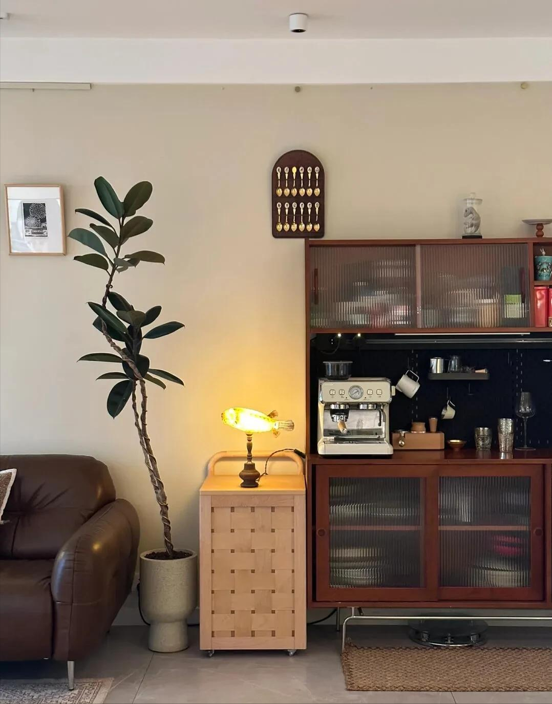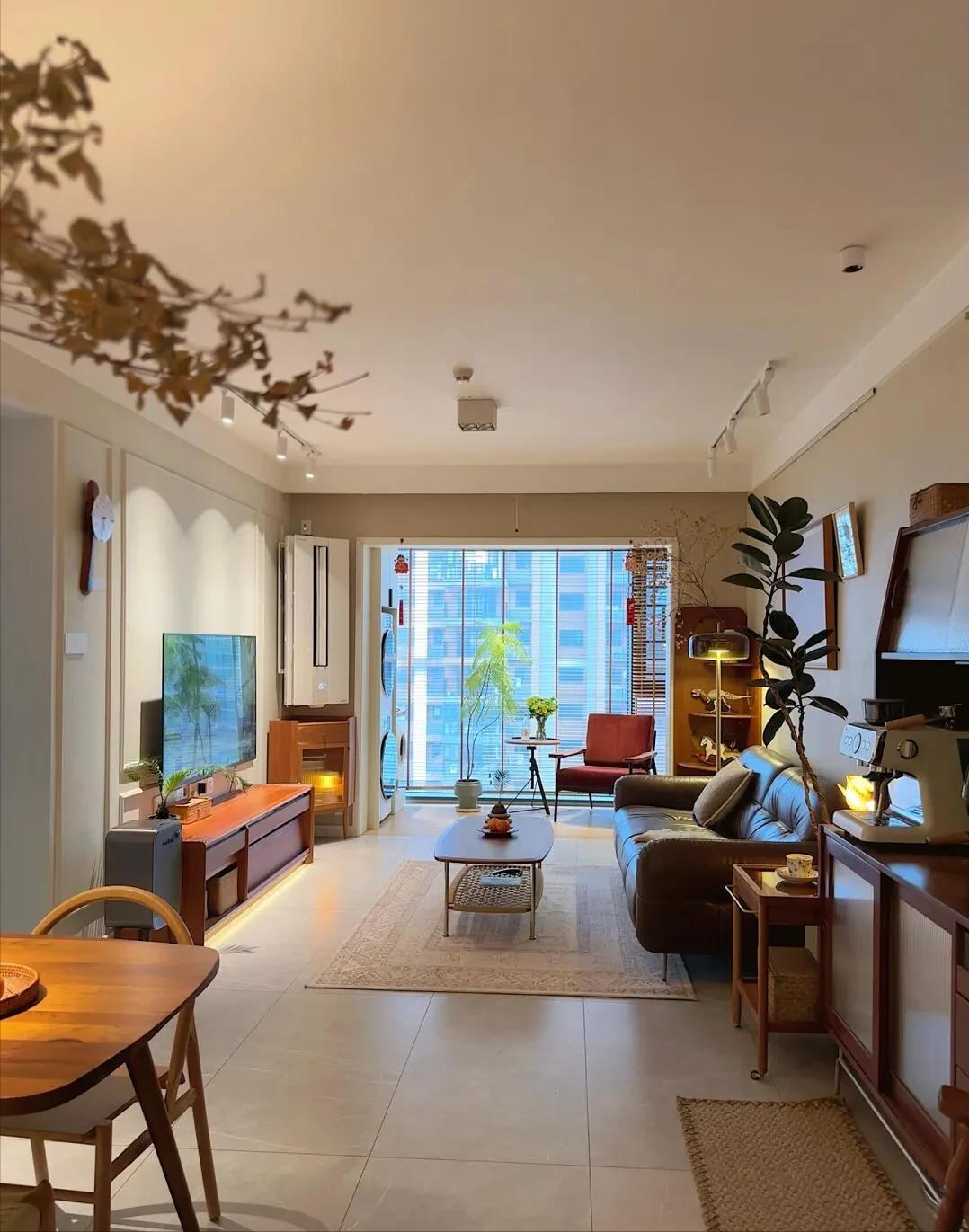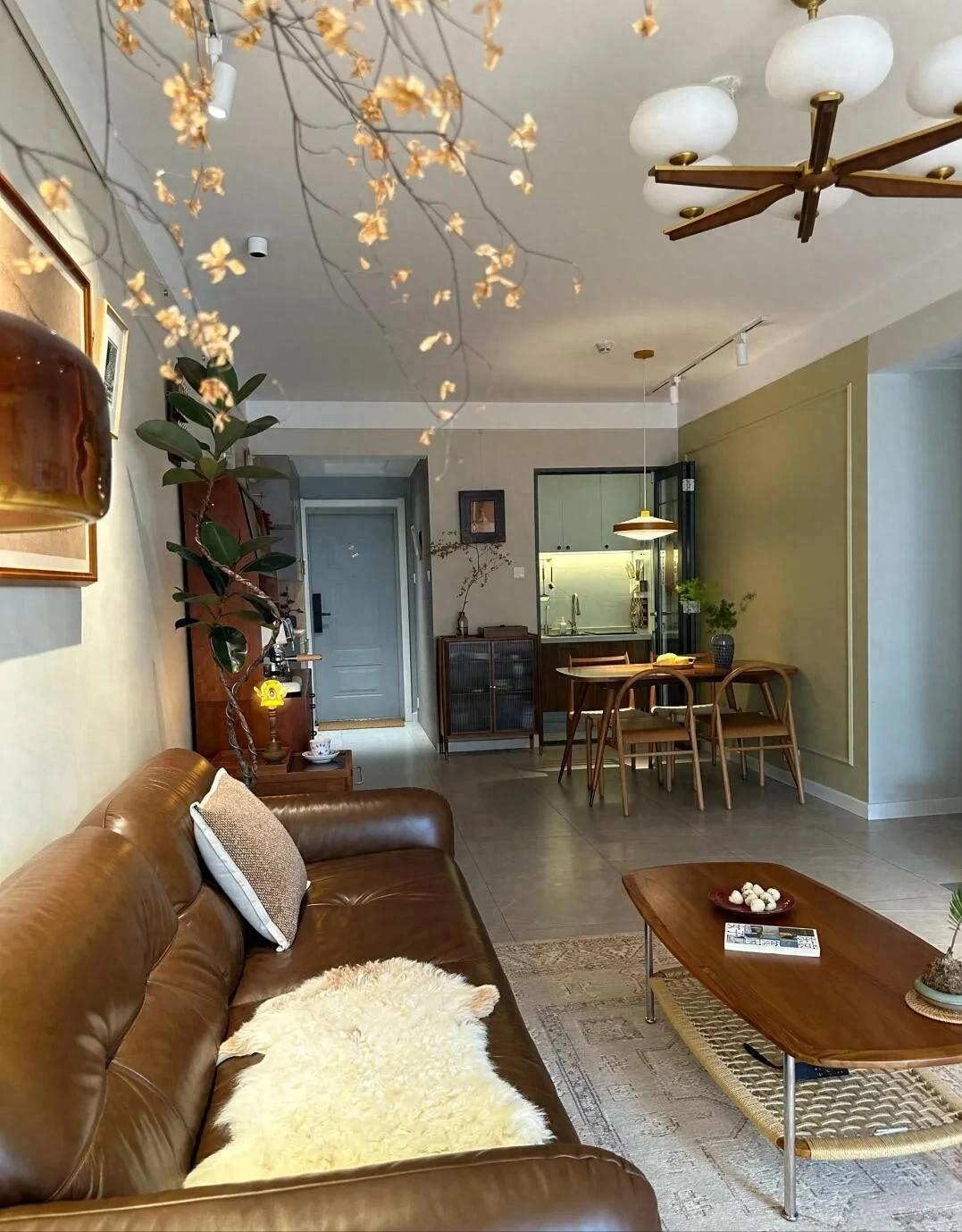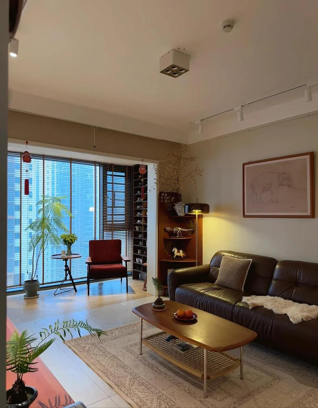 先瞅瞅这设计风格,中古风的复古韵味那是拿捏得死死的。一进门,棕色皮沙发搭配上木元素的茶几、柜子,瞬间有种穿越到上世纪复古电影里的感觉。绿植和各种小摆件恰到好处地点缀其中,既有岁月的沉淀感,又不失生活的气息。