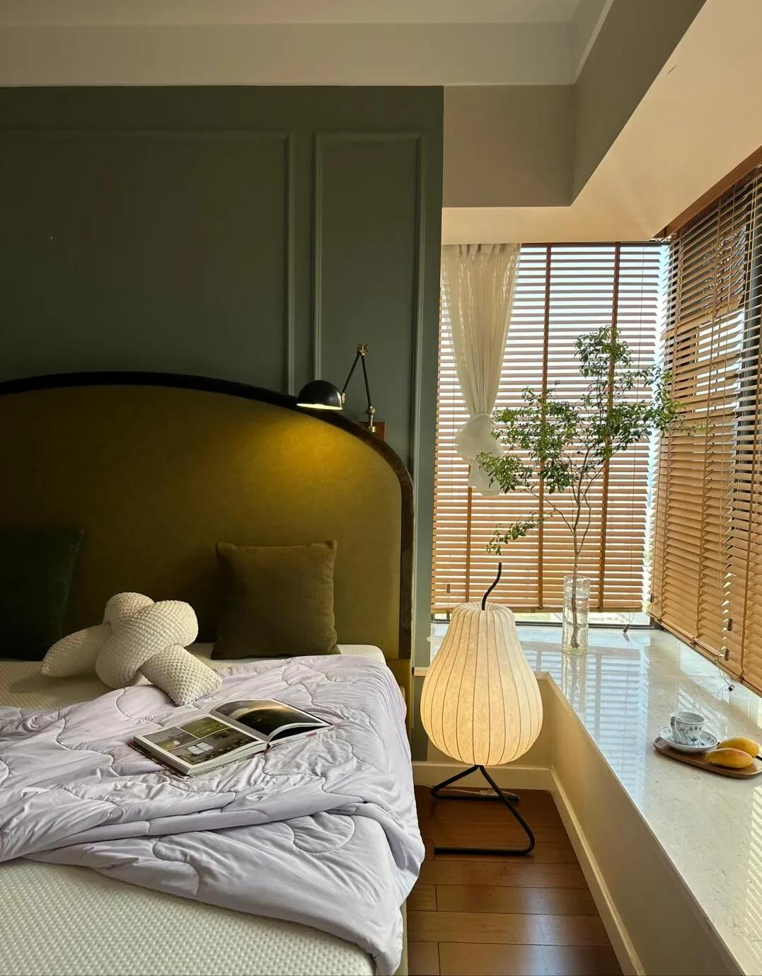 再看看颜色搭配,整体以暖色调为主,墙面的米色、绿色,搭配棕色的家具,就像一杯温暖的拿铁,看着就舒服。卧室里深绿色的床头背景墙,配上淡紫色的床品,高级又温馨,每天往床上一躺,所有疲惫都烟消云散。