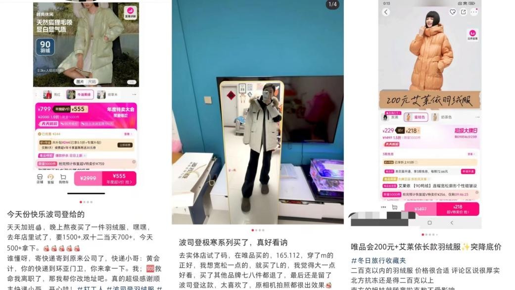不少网友也纷纷分享自己的过冬羽绒服,比如有人买了波司登极寒系列羽绒服,还有不少人挤进奥莱唯品会等折扣店购买大牌羽绒服,更有不少网友分享出自己花200-500元买的高性价比羽绒服。