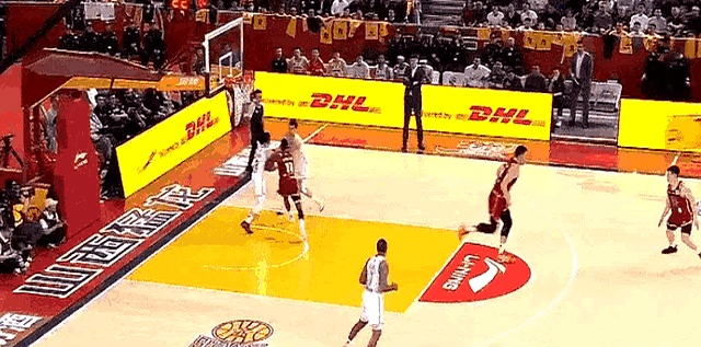 三分球三个全中,一个人拿了13分,带着广东队36比29领先。