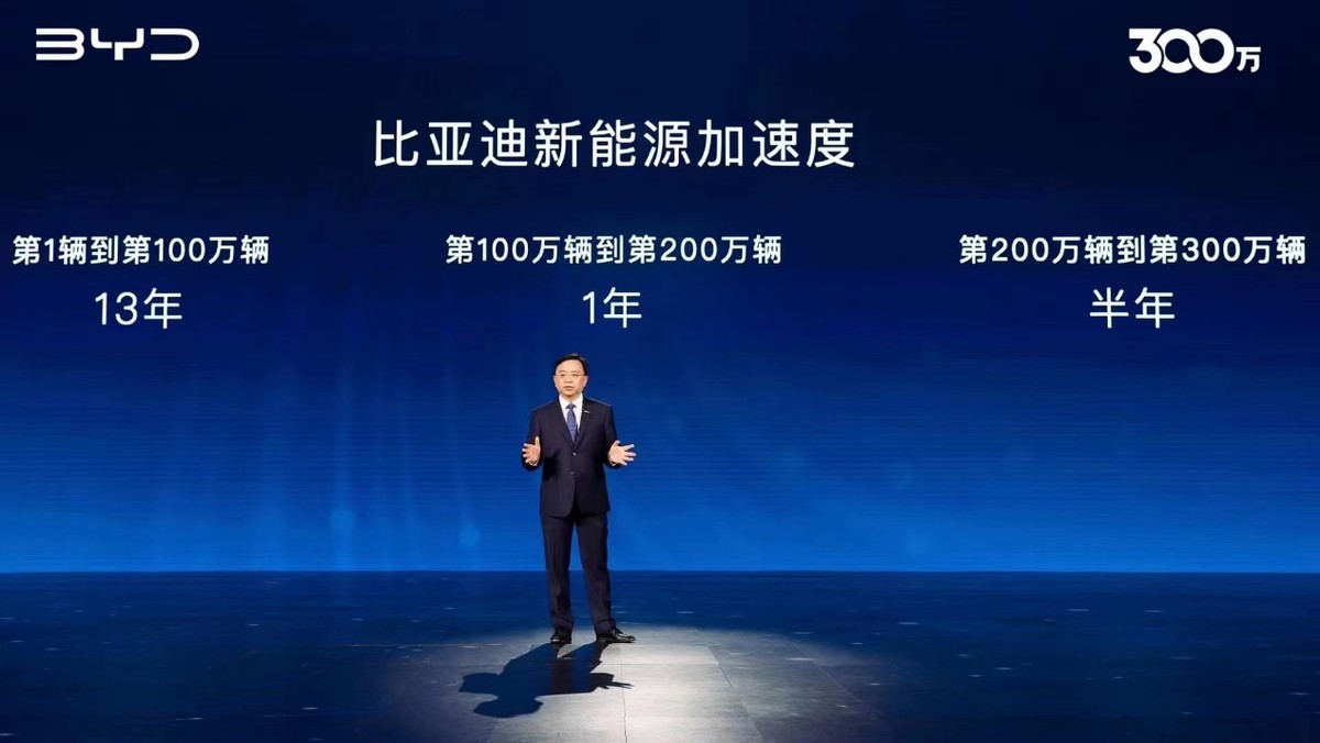 从“第1辆新能源汽车到第100万辆新能源汽车”用时13年、从“100万到200万”用时1年,从“200万到300万”仅用时半年,比亚迪在新能源赛道上演全新“加速度”,持续领跑整个新能源汽车市场,推动中国汽车的崛起步伐,加速全球绿色出行变革。
