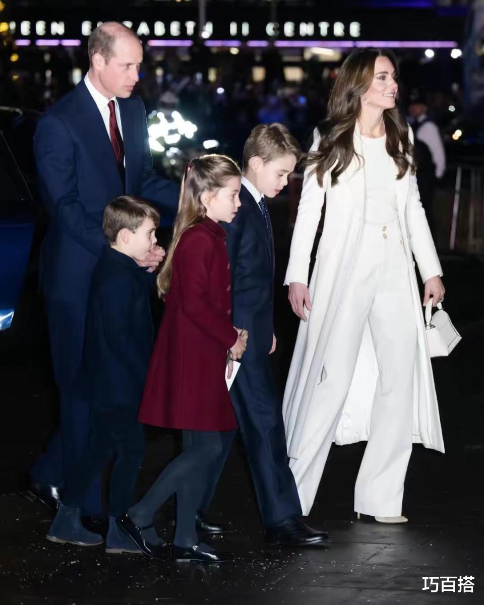 凯特王妃的圣诞穿搭有时也会出其不意,这次选择纯白色套装的她瞬间成为全场焦点,和西装革履且很有节日氛围的老公、孩子相比,她的造型相对低调。