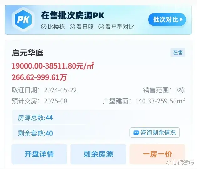而同板块的新房里,尾盘的龙湖天府晴川,均价2.4—2.6w,总价310w起。4月刚取证的建发璞云,单价2.4—2.6w,总价270w起。