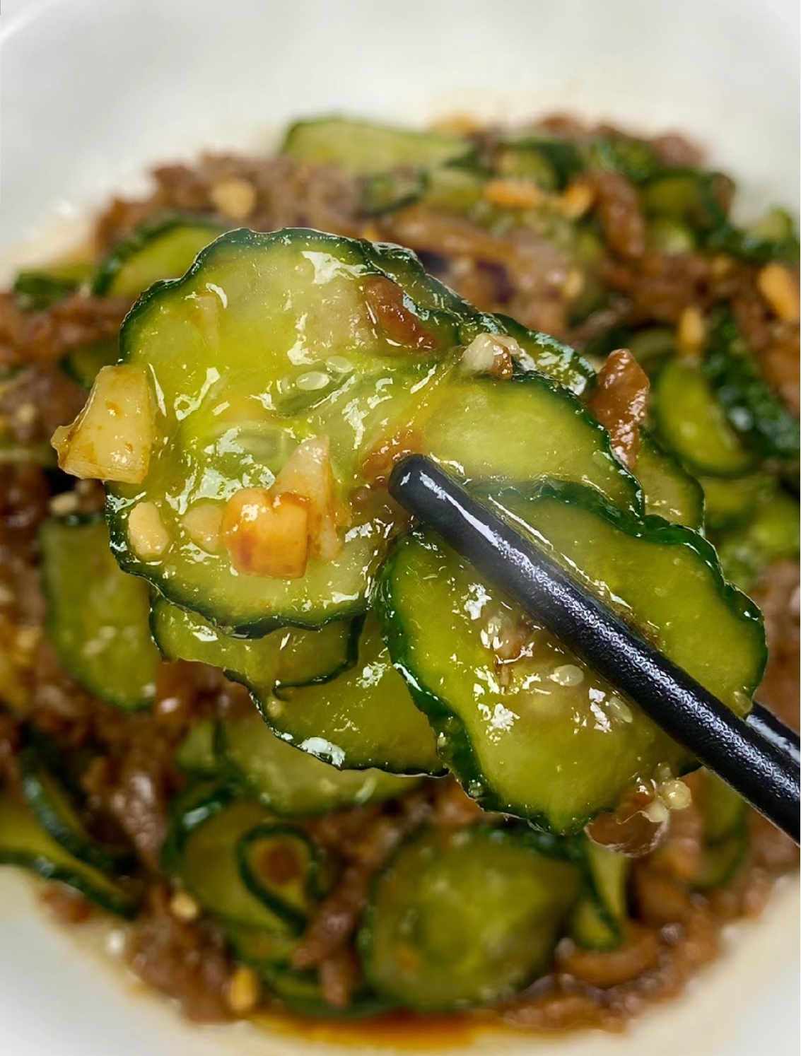 接着,倒入黄瓜片快速翻炒均匀,再加入之前炒好的牛肉片,继续快速翻炒。