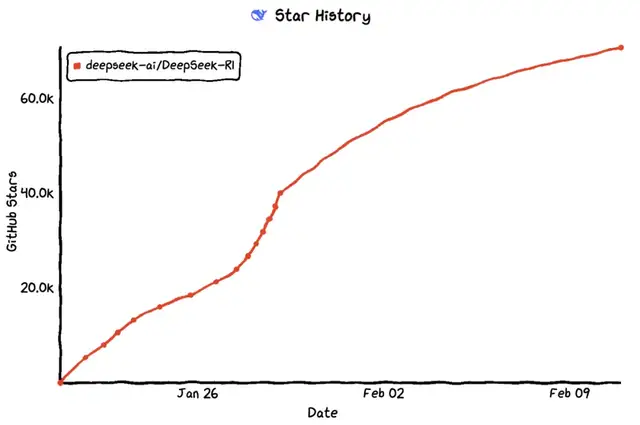 GitHub的Stars是项目在社区中受欢迎程度的直接指标,Fok则表示项目累计被用户拷贝的数量,两个指标均代表项目上线至今的关注度和用户喜爱度。DeepSeek V3和R1两个项目上线至今均不足2个月,但它们的累计Star和Fork均与上线时间更早的Llama接近,显著高于24年4月发布的Llama3,直接反映了开发者对DeepSeek开源模型的高认可度。目前DeepSeek R1在GitHub上的开发者点赞数量已经达到约5.7万。根据GitHub、Hugging Face社区上的开发者实测,经过R1微调的80亿参数小模型可以在个人笔记本中运行,本地化部署门槛显著下降,应用的开发将迎来百花齐放。