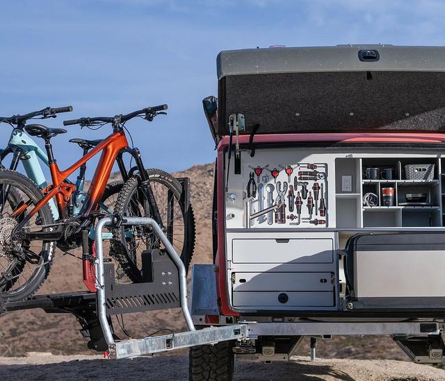 Topo2 MTB最大的亮点在于它的多功能性和用户友好性。作为专为骑行者定制的产品,Topo2 MTB配备了一个极具实用性的自行车维修区,骑行者无需在露营地胡乱查找工具,想要修理自行车时随时都能找到所需的设备。拖挂房车后部的旋转折返式挂钩设计,允许用户在不卸车的情况下完成各种操作,极大地方便了户外生活的和击,充分考虑了骑行者的需求。