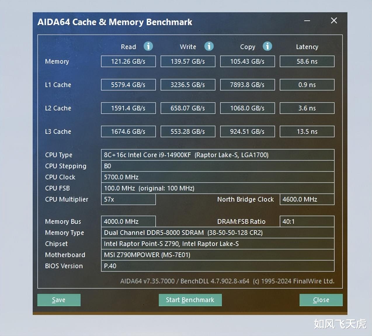 AID64内存测试,读取121.26GB/s,写入139.57GB/s,复制105.43GB/s,大幅提升了读写速度。而延迟也大幅减少到了58.6ns。