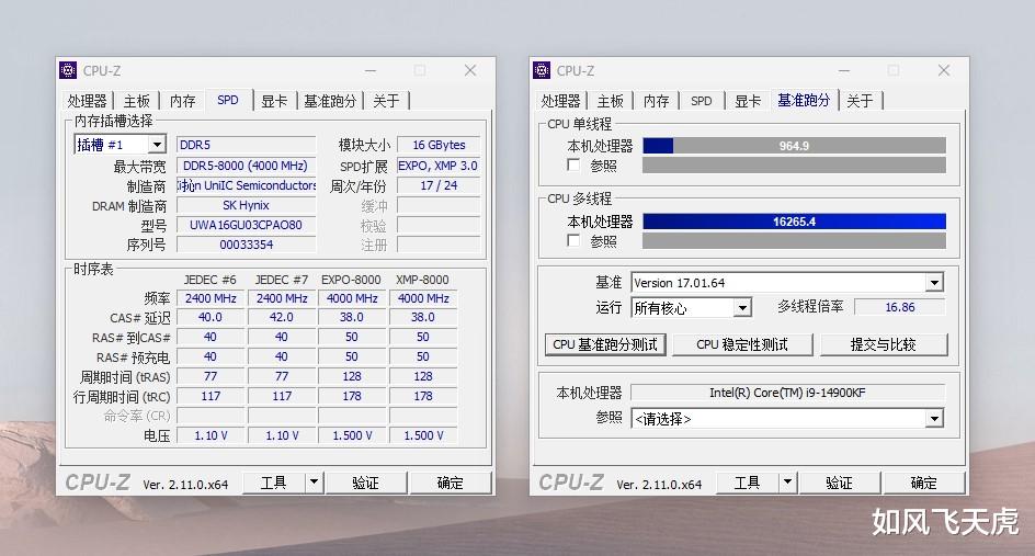 看下CPU-Z,单核提升到了964.9,虽然说CPU-Z的数据不太稳定,但是内存的提升对于性能有提升也是确定的。