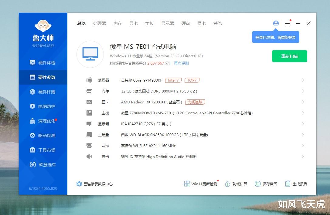 运行鲁大师,看看系统配置,我们看到,CPU是英特尔i9-14900KF,内存识别是32GB (紫光国芯 DDR5 8000MHz 16GBx2),显卡是SAMD RX7900XT 蓝宝石,主板是微星Z790MPOWER,硬盘是西数WD_BLACK SN850X,配置都正确识别了。