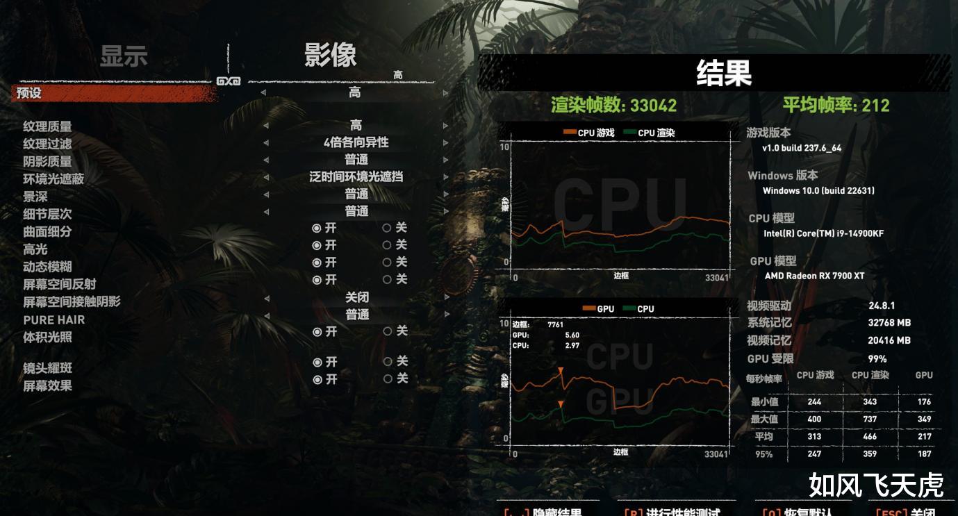 古墓丽影.暗影,默频下平均帧数CPU游戏245,CPU渲染400。