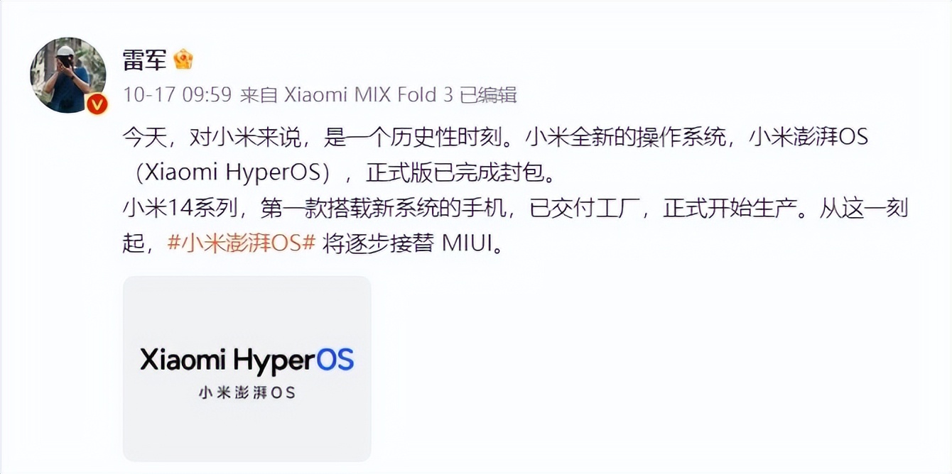 最近,小米CEO雷军发布微博,宣布小米全新操作系统小米澎湃OS((Xiaomi HyperOS))正式版完成封包,小米14作为首搭产品已交付工厂开始生产;并称,未来澎湃OS将逐步取代MIUI,成为小米生态的软件系统支撑。