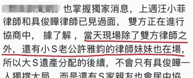 许雅钧的妹妹以律师的身份帮助具俊晔,最近也与汪小菲的律师进行了接触谈话。
