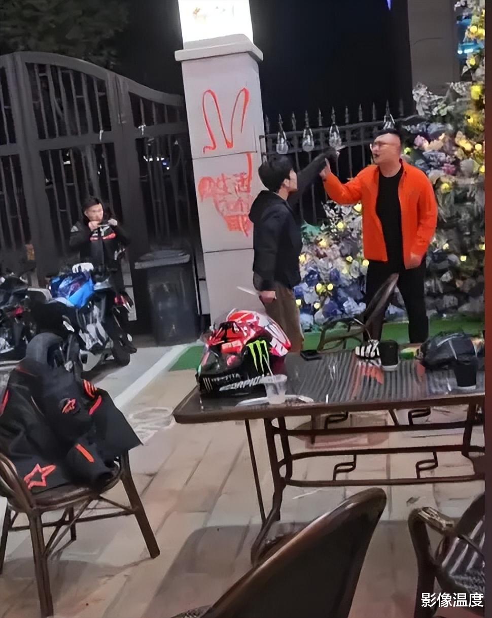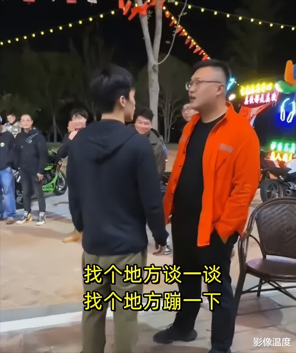 当天晚上,穿黑衣的车主康某,怀揣匕首,来到在咖啡店门口聚会的一群摩托车车友面前,他找到穿红衣的徐某聪论理,大家看,这个红衣男子很是拽,身边的摩友似乎也在嘲笑这个小伙子,红衣徐某聪说找个地方谈一谈,或者找个地方蹦一下: