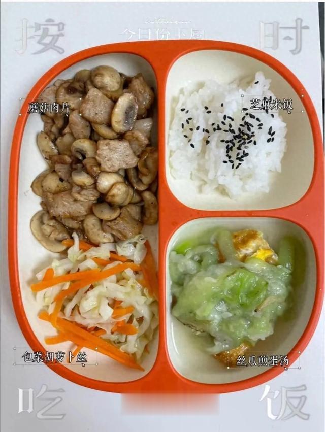 【蘑菇肉片,包菜胡萝卜丝,丝瓜煎蛋汤】