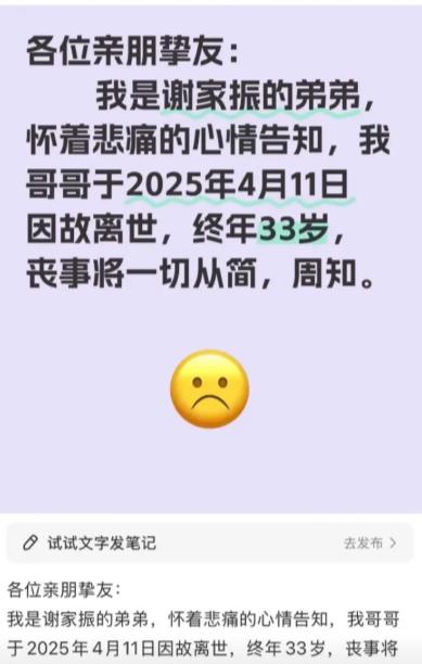 随后谢家振的账号被弟弟登上,告诉了广大网友自己哥哥确实已经离世的消息,并清空了账号中的所有内容。