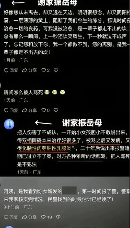 随后有人找到了谢家振岳母的短视频账号,在一则岳母的评论中得知了女孩生前的遭遇。
