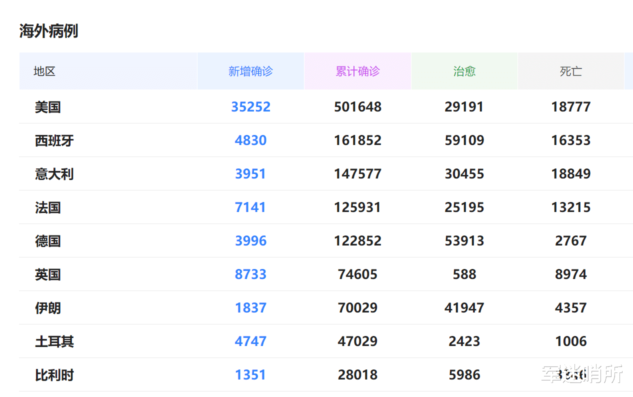其中美国的疫情最为严峻,累计确诊人数501648人,占到了全球累计确诊人数的30.81%,新增人数为35252人,战全球新增人数的39.40%,累计死亡人数18777人,治愈29191人。