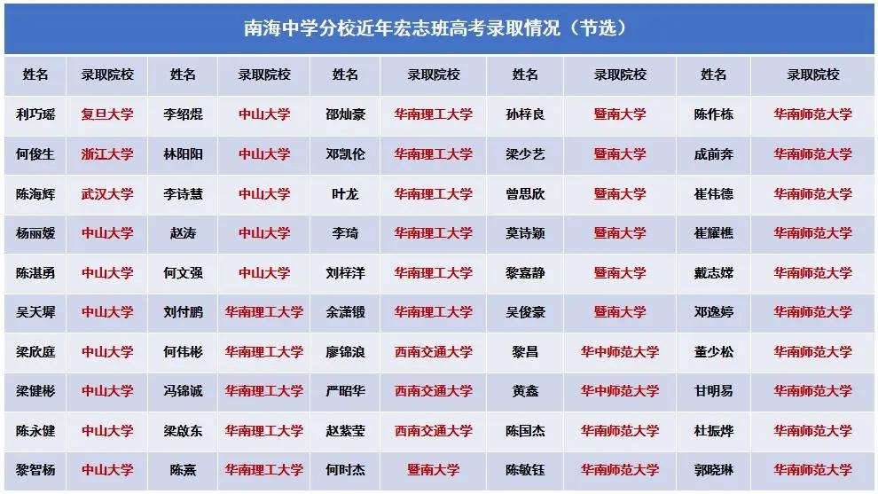 近年来,我校宏志班高考成绩优异,可媲美南海中学本部平行班。宏志班利巧瑶、何俊生、陈海辉、李诗慧、何文强、郑力诚、邓烨、林诗雨等一大批优秀学生先后被复旦大学、浙江大学、武汉大学、中山大学、华南理工大学、北京师范大学(珠海校区)、华南师范大学等国内“双一流”大学和重点名校录取。