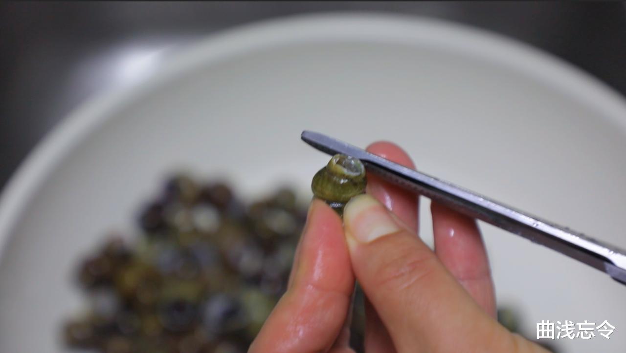 3、逐个清洗,刷去表面污垢,剪去螺尾,再次清洗干净滤干备用。