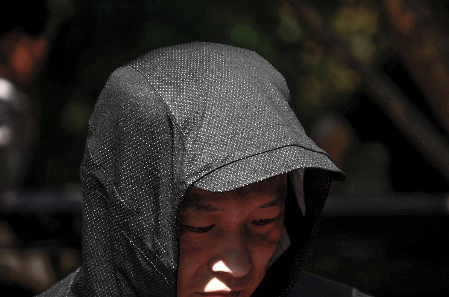 单导热寂遮热服为了更全面地遮挡阳光热量,采用了带帽设计,而且帽兜较深,可以完全把头部藏入其中,左右两侧也向前延伸,能够有效遮挡两侧的光线和热量。
