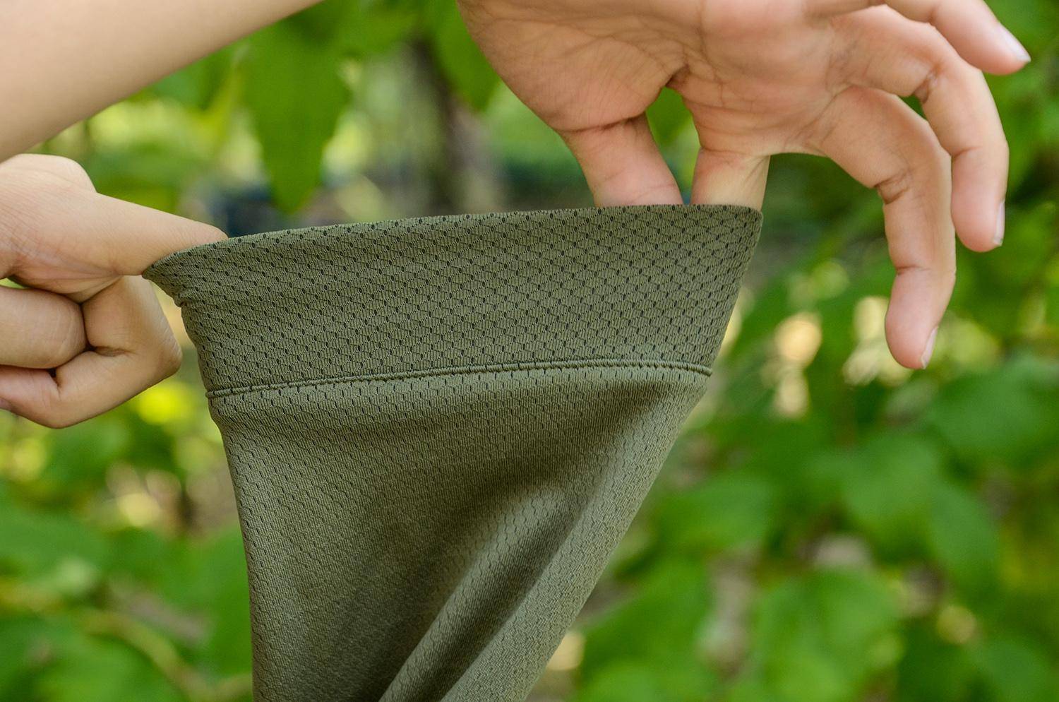 袖口做了对折缝制,加厚面料加重效果,保持正常摆臂时袖子自然下落,起到全时遮挡阳光的作用。另外,袖口也有良好的弹性,如果卷起袖子,也可以保证足够的力度,不致下滑。