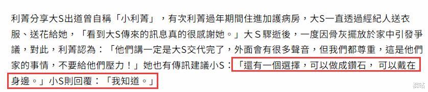 利菁还透露已经给小S发消息,说可以把骨灰做成钻石戴在身边,这样就能解相思之苦,小S回说:知道了。不知道小S和姐夫具俊晔,会不会真的用这种方式长久留住大S。