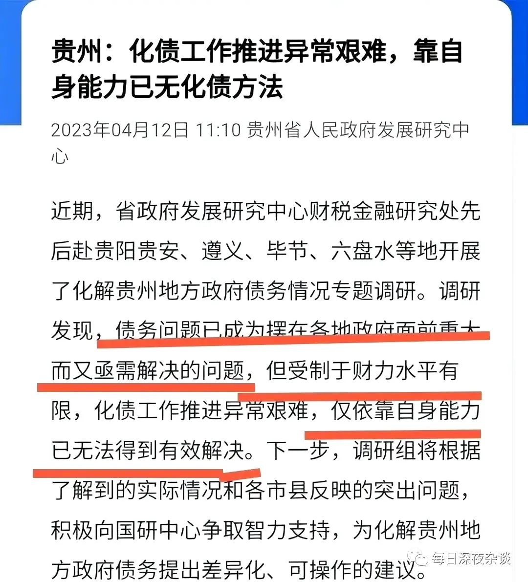 恰好这两天,贵州省政府公开承认无力偿还债务。难道省政府要破产?银行会不会受牵扯,百姓存款有没有影响?2023年到现在,几个“反常”:1.编制外人员缩减的同时,农业执法队伍换新装;2.大批人员失业涌入外卖队伍,3月份居民银行存款新增15万亿;3.央行M2增发60万亿与贵州省政府债务无力偿还,等等。以第3个来讲,根据贵州省2022年债务分析,全省财政总收入3194.18亿元,加全省一般公共预算收入1886.36亿元和中央转移支付3649.1亿元、一般债务收入1061.33亿元(含再融资债券)、调入预算稳定调节基金359.03亿元、调入资金584.93亿元、上年结转254.8亿元,收入合计7795.55亿元。
