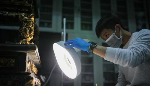 冬日的夜晚总是比人们想得来的更快一些,在同事们下班后,90后修复师林友淦还在岗位上加班。他将遮光窗帘拉下,最后一抹亮光也在工作室中消失,随后打开的紫光灯让他面前的潮汕木雕发出点点紫光,林友淦用相机记录着木雕在紫光灯的照射的种种反应,这是他用来修复潮汕木雕的标准。
