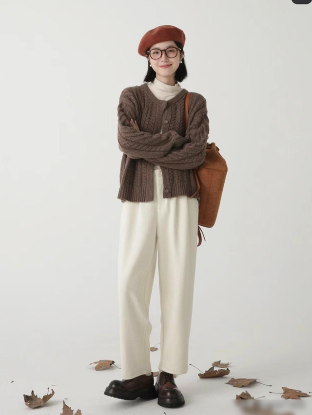 这里给出的建议是选择短款毛衣与高腰奶奶裤进行组合搭配,其实这个提出就是为了能够让穿着者展示出标准身材比例。