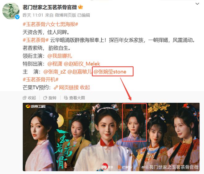 离开节目后,于正也是直接将她带到了,他的新剧《玉茗茶骨》中饰演女配。与她搭档的是古力娜扎与侯明昊
