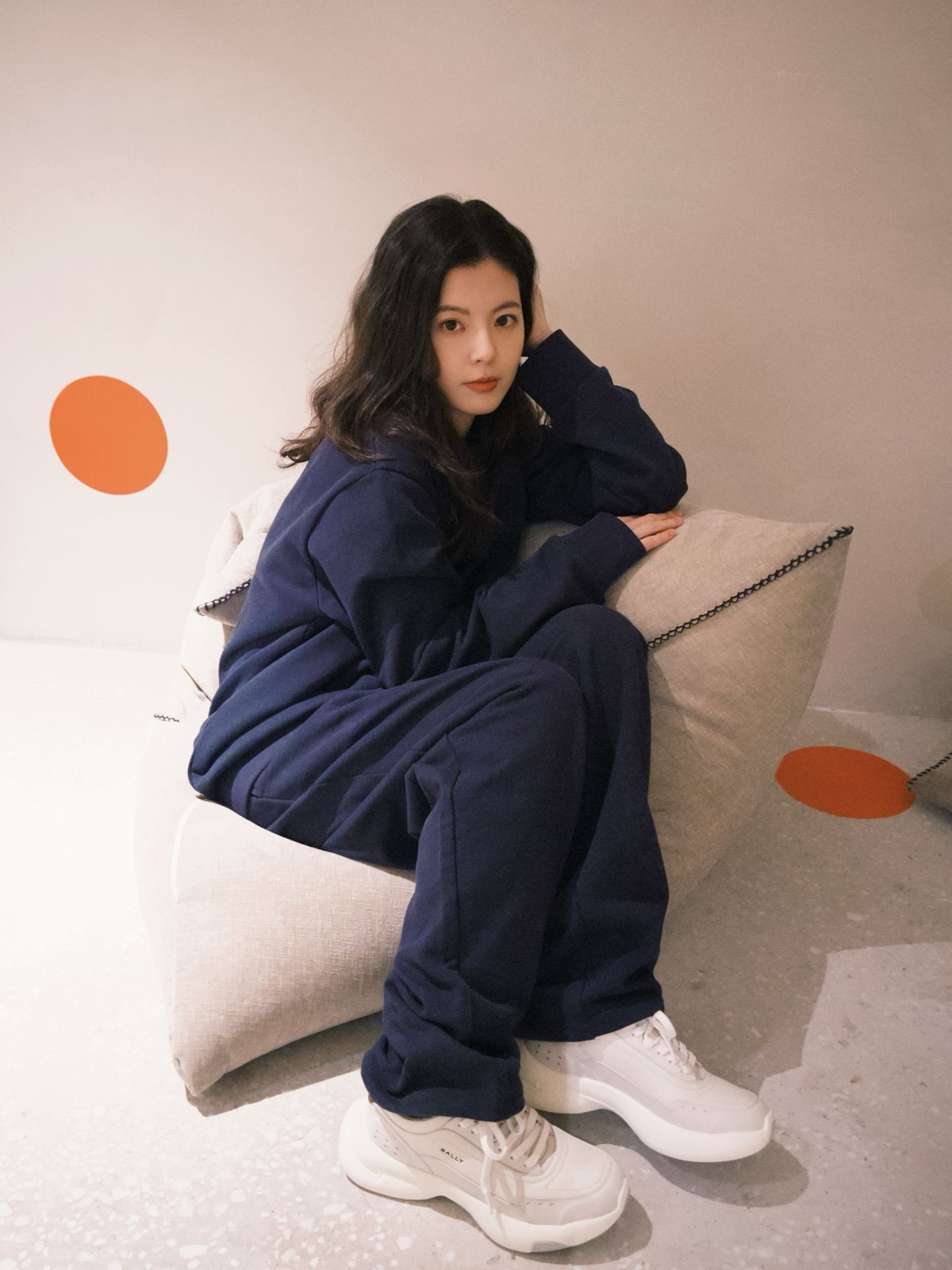 演员关畅穿着 Bally 2025蛇年限定款蓝色圆领卫衣、休闲运动裤和 Dune 女士运动鞋,演绎趣味美学,活力向新,传达新年期许。